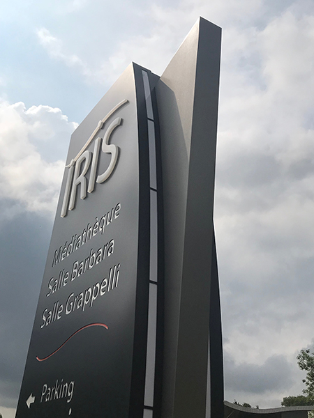 Pour garantir la durabilité et la robustesse de cette signalétique, nous avons conçu une structure en acier galvanisé, assurant une résistance optimale aux conditions climatiques. L'habillage des faces en aluminium évidé a ensuite été réalisé, offrant un esthétisme moderne et aérien. Ce choix de matériau permet non seulement de symboliser avec finesse la forme de la fleur d'Iris, mais aussi d’optimiser l’éclairage. En effet, l’éclairage double et transversal par modules leds a été intégré dans la structure, garantissant une visibilité parfaite de jour comme de nuit. Cette configuration assure un éclairage homogène et efficace, renforçant l'impact visuel du totem.