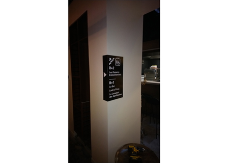 En complément des panneaux de signalisation, l’équipe Pelletier a installé des caissons drapeaux non lumineux en imposte, permettant de signaler tous les restaurateurs présents sur site. Ces caissons, fabriqués en aluminium et disposés à des emplacements stratégiques, offrent une visibilité optimale sans nuire à l’esthétique du lieu. L’intégration de cette signalétique discrète mais efficace renforce l’identité visuelle du projet tout en répondant aux besoins de signalisation des différents points de restauration. Grâce à un survey approfondi, Pelletier a pris en compte la configuration des lieux pour adapter parfaitement l’installation à l’architecture et aux flux de circulation. Ce projet illustre l’expertise de l’entreprise dans la création et la pose de signalétiques sur mesure, tout en répondant aux attentes précises du client en matière de design et de fonctionnalité.