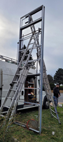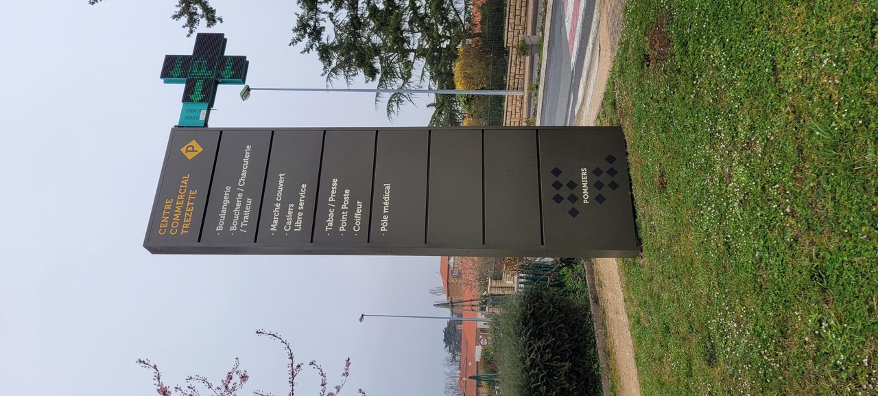 Une fois les mesures prises et les plans validés, l'atelier Pelletier a conçu des caissettes en aluminium plié sur mesure, spécialement adaptées aux dimensions du totem. Ces éléments ont ensuite reçu un laquage époxy aux couleurs RAL choisies, garantissant non seulement un esthétisme conforme à la charte client, mais également une résistance optimale aux intempéries. Pour finaliser cette phase de rénovation, le marquage adhésif a été appliqué avec précision selon les spécifications du client, assurant une cohérence parfaite avec l’identité visuelle de la commune et la lisibilité des informations.